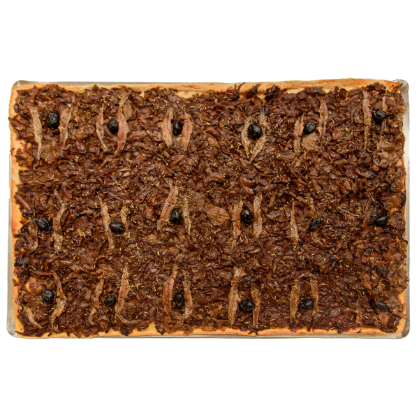 Plaque de 18 portions de notre pissaladière réalisée avec des oignons caramélisés, des anchois et des olives noires parsemés d’herbes de Provence et d’huile d’olive.