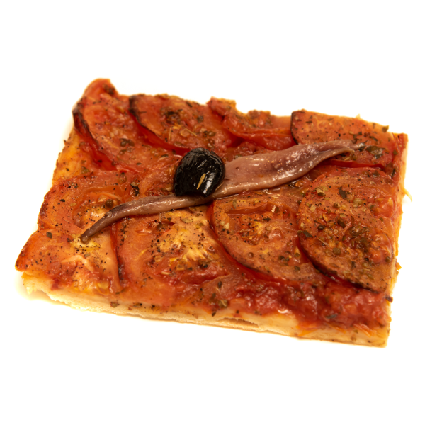 En portion individuelle, notre pizza est réalisée avec des tomates fraiches, des anchois et des olives noires parsemées d’origan et d’huile d’olive.
